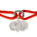 Signature caravan charm accented by a solitary natural diamond on a lobster clasp allowing interchangeable threads.